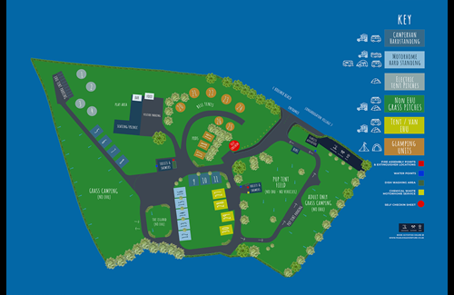 PLEASE NOTE: only EHU pitches and Glamping tents have allocated pitch numbers. All other areas have marked pitch spaces but are not allocated. Please just find your booked area on the map and pitch in an available marked space.